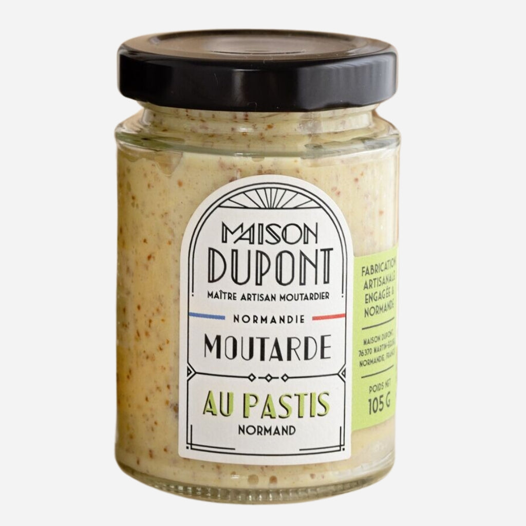 A fresh, plant-based mustard, enhanced by the spicy bouquet of Pastis Normand from the Distillerie de la Seine! A delicate aniseed and floral touch to accompany fish, white meats and cold meats. Handcrafted in Normandy, from French mustard seeds.